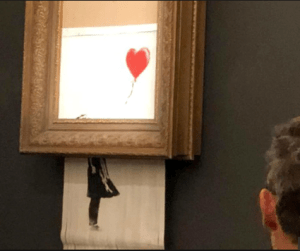 Este fim-de-semana, não foi excepção e ficará para sempre recordado como o momento em que o artista destruiu a própria obra, segundos após esta ser arrematada por um milhão de libras no leilão da Sothebys. (Podem ver o vídeo aqui.)
