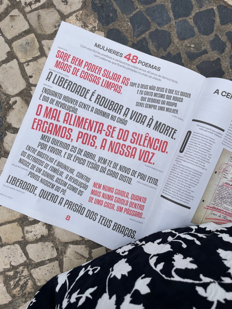 No âmbito das comemorações do 25 de Abril da Câmara Municipal de Lisboa, fui convidada para participar no projecto 48, uma das iniciativas que marcam os quarenta e oito anos de democracia após quarenta e oito anos de ditadura. O desafio foi lançado a (precisamente) quarenta e oito mulheres escritoras, poetas e cantautoras, as quais deveriam criar uma frase, aforismo ou verso que renovasse os valores da Liberdade. O resultado será pintado no chão das principais ruas e praças da cidade, para que todos possam ler e ter uma perspectiva feminina sobre esta data.