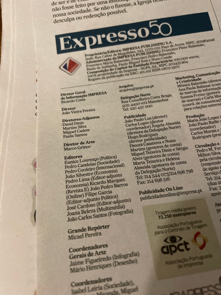 Se não, vejamos. É um jornal feito maioritariamente por homens, brancos, maiores de 45 anos, onde as mulheres não ascendem a lugares de chefia nem são dignas de figurar nas fichas técnicas (exceção feita a Paula Santos), cujos cronistas semanais são todos homens, excepto a Clara Ferreira Alves, cujas colunas de opinião têm um racio igual, e que esta semana lança um suplemento sobre “50 personalidades que marcaram + 50 que vão marcar o país e o mundo”, com um primeiro volume que nos traz 16 homens notáveis, mas apenas quatro mulheres.